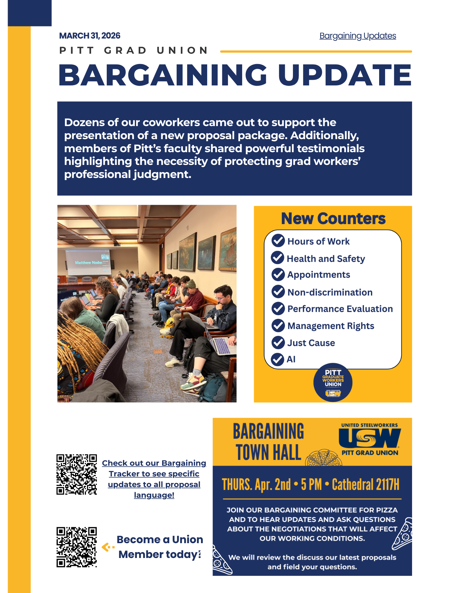 Join us this Thursday April 2nd in the Cathedral of Learning 2117H for our next bargaining townhall to talk about our most recent session and any questions you may have about the bargaining process. To get connected to our organizing committee’s efforts, follow @pittgradunion on social media and get connected to an organizer in your field by clicking here.